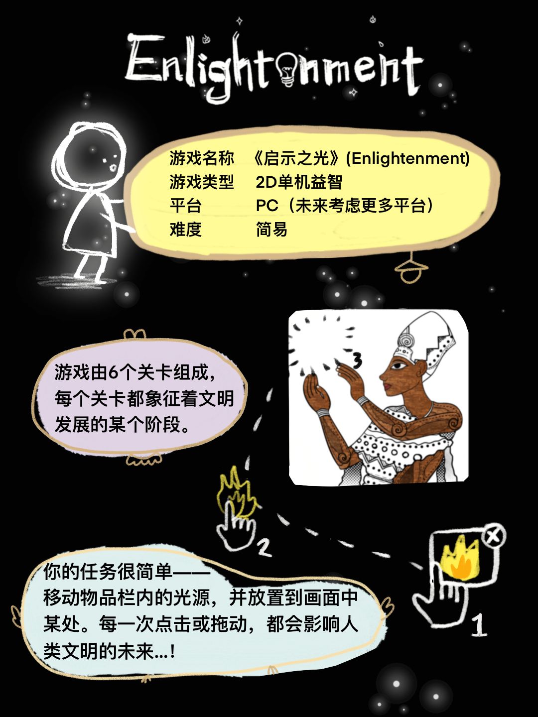 《启示之光》由6个独特关卡组成,每个关卡都象征着文明发展的某个阶段。你(玩家)的任务很简单——移动物品栏内的光源,并放置到画面中某处。每一次点击或拖动,都会影响未来,甚至改写人类文明的发展方向......或者没有?