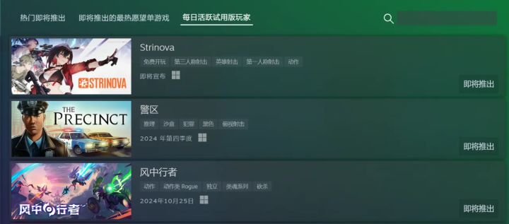 每日活跃试用版榜单国产射击游戏《卡拉彼丘》的海外版本《Strinova》始终名列前茅。