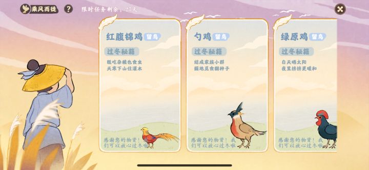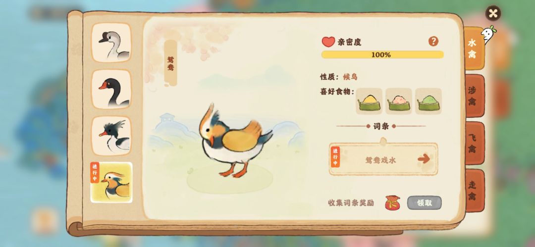 左下角鸟事里面,每只鸟儿有个词条,点进去选出对应的鸟儿就可以获得一些奖励。