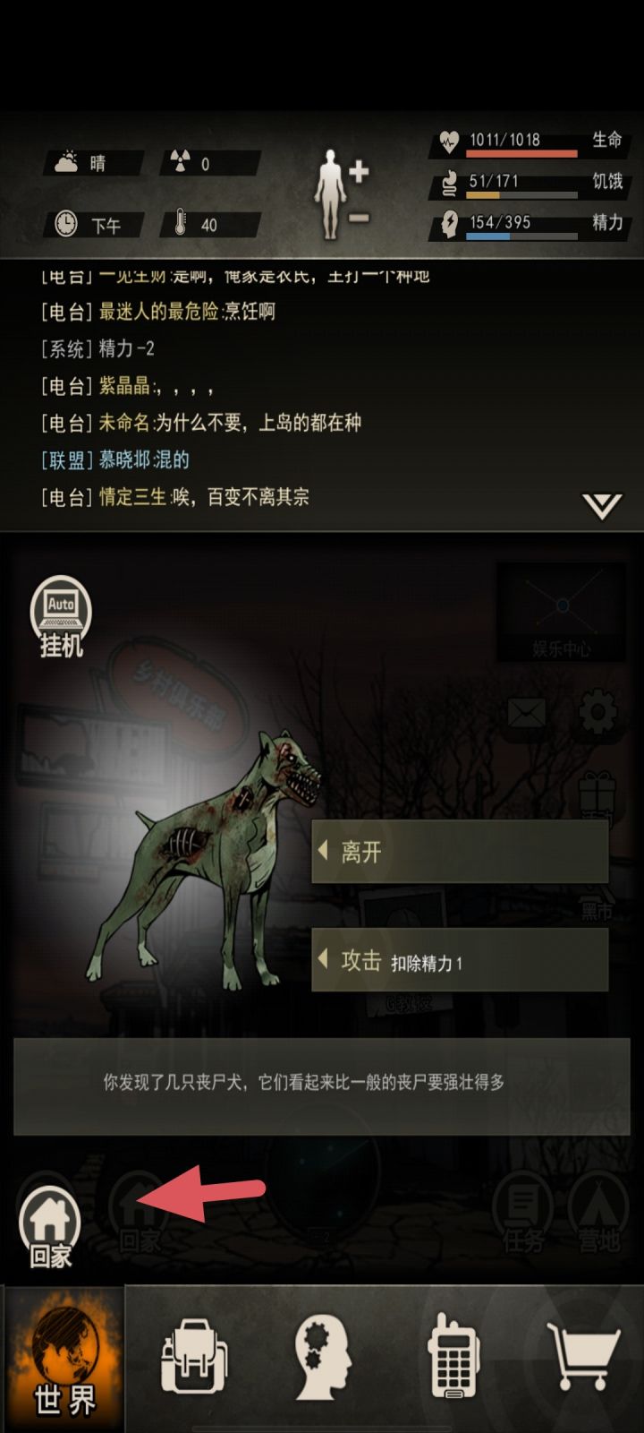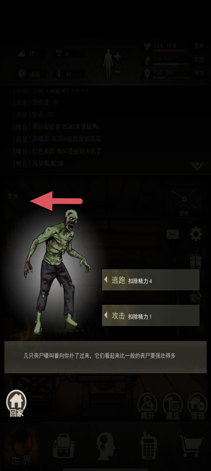 第一步:提前将床或者器材的位置设置到打怪攻击键的位置,先搜8号公路或者娱乐,娱乐向右向前向前,先搜到怪。点击攻击后,快速点击回家按钮,(注意需要点击背景的回家按钮,不能点击表面的,手速不够需要多试几次)直到背景成为营地。