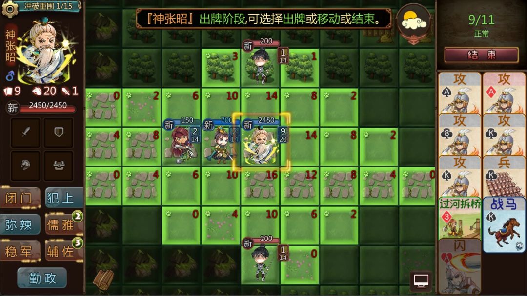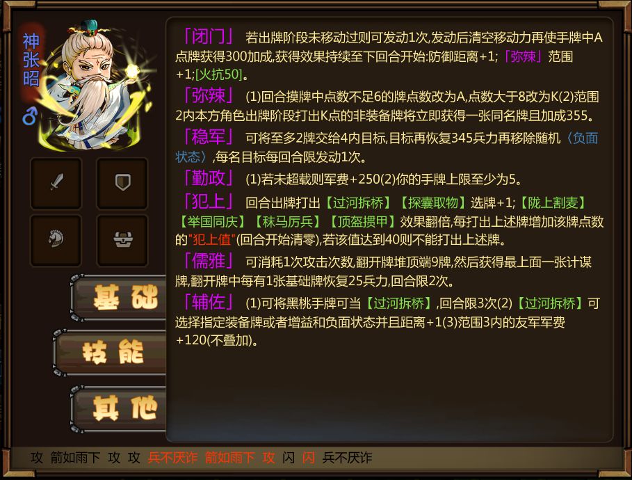 「儒雅」:可消耗1次攻击次数,翻开牌堆顶端9牌,然后获得最上面一张计谋牌,翻开牌中每有1张基础牌恢复25兵力,回合限2次。