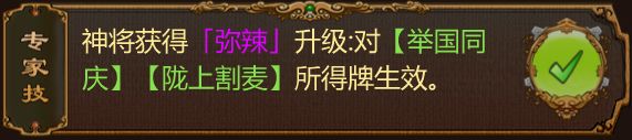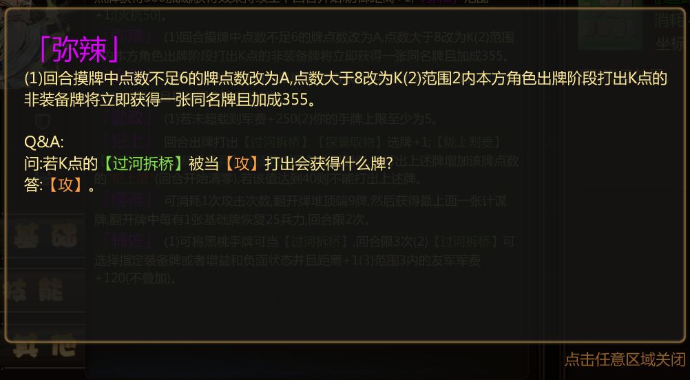 「弥辣」:(1)回合摸牌中点数不足6的牌点数改为A,点数大于8改为K(2)范围2内本方角色出牌阶段打出K点的非装备牌将立即获得一张同名牌且加成355。