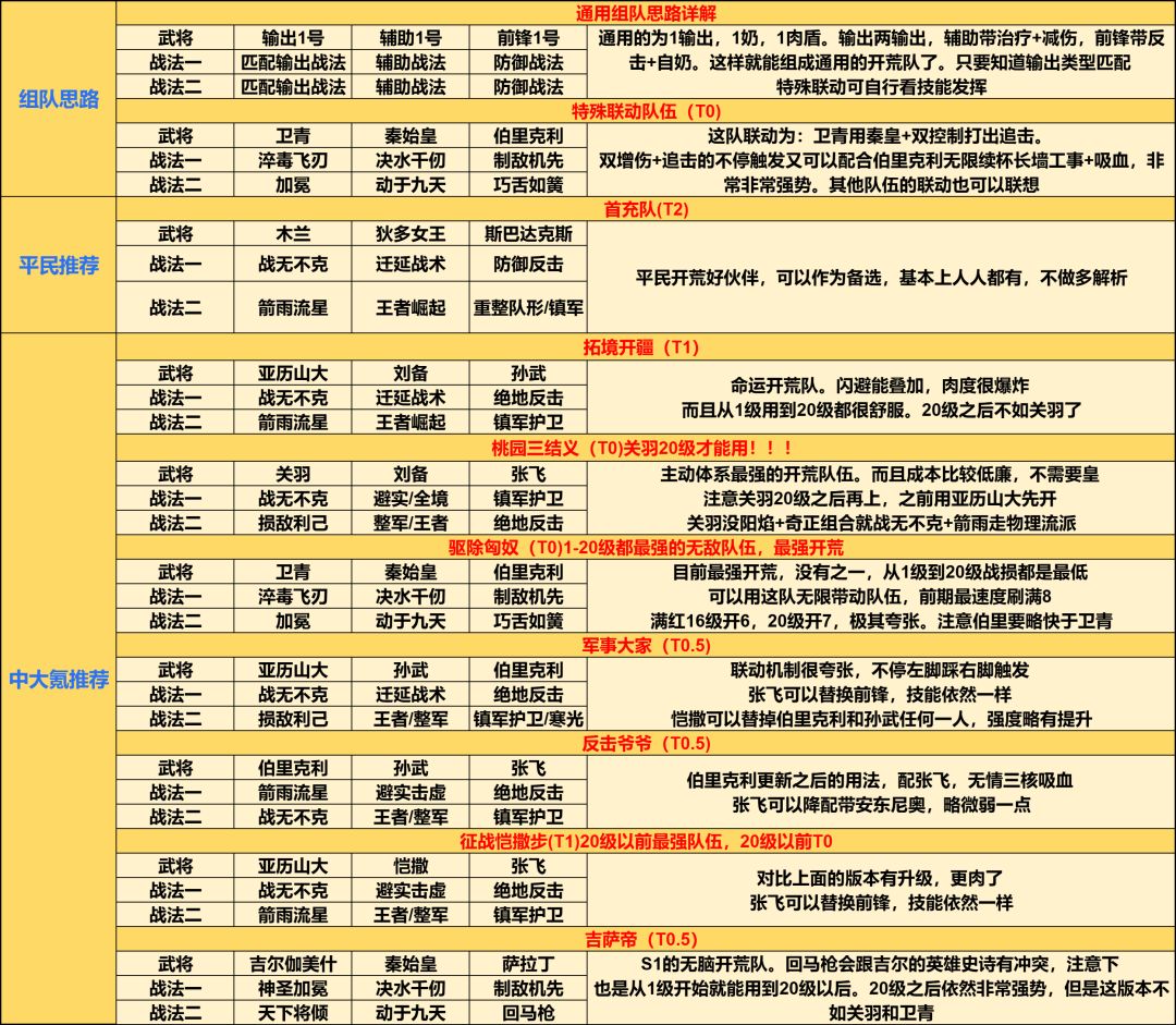 先清楚开荒的基本思路,要么是治疗+输出,持续8回合的队伍。要么是暴力输出队伍,迅猛结束战斗开荒(吉萨帝),除了肉队开荒外(1输出+1治疗+1前锋),其他开荒的,只能玩吉萨帝和卫青秦始皇伯里克利,其他体系在开荒中的容错率有待验证。