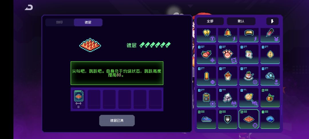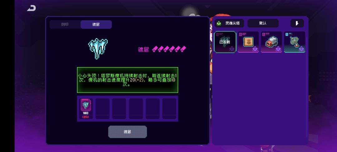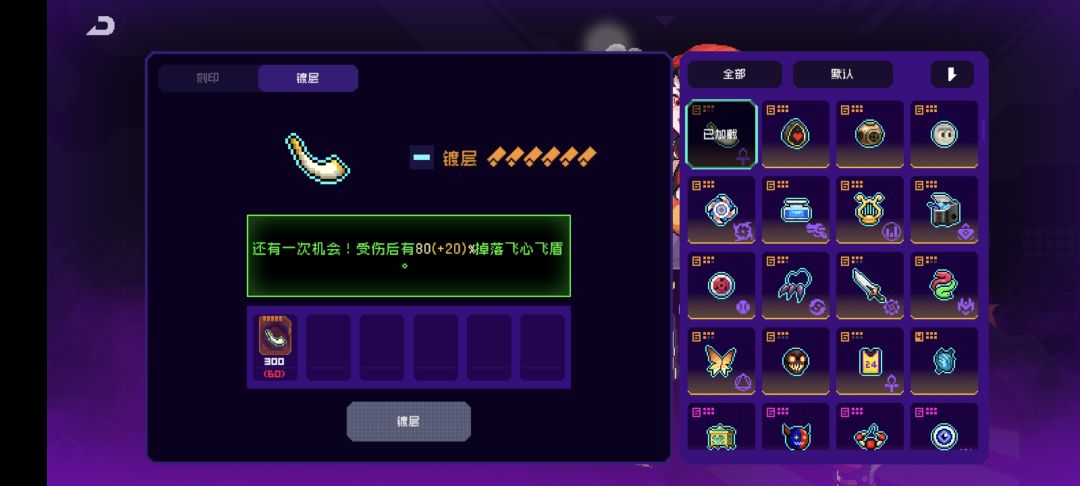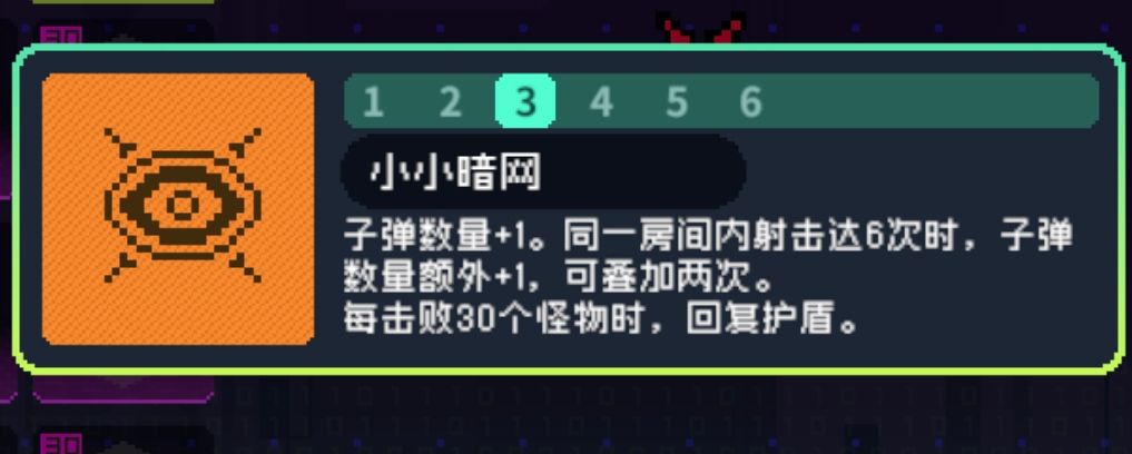 流量表,陆战头盔,雷电引擎等跟蓝盾有关的纪念品,红叶的蓝盾改成了飞镖“毛巾”,陆战加子弹和雷电加射速都不吃,指压板也不推荐捡,天赋点个二段跳就够用,捡了指压板跳更容易碰到房间里的尖刺,飞镖-1😡