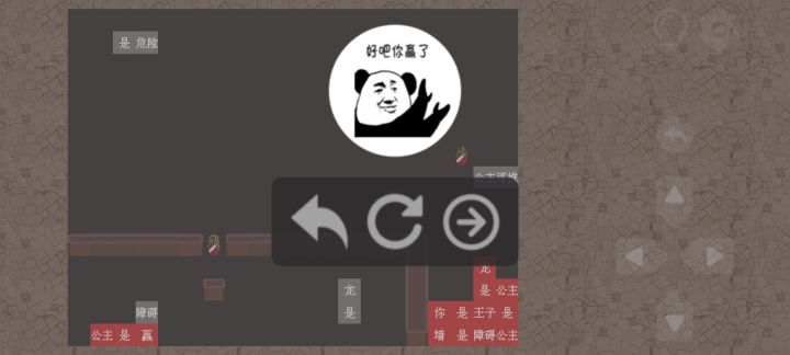 第十七关,把“龙是危险”和“公主是可推”拆了,和“你是王子”组成“龙是王子”,【龙】变成【王子】,就可以拆了“公主是障碍”和“龙是赢”,重新组成“公主是赢”,碰到公主即可