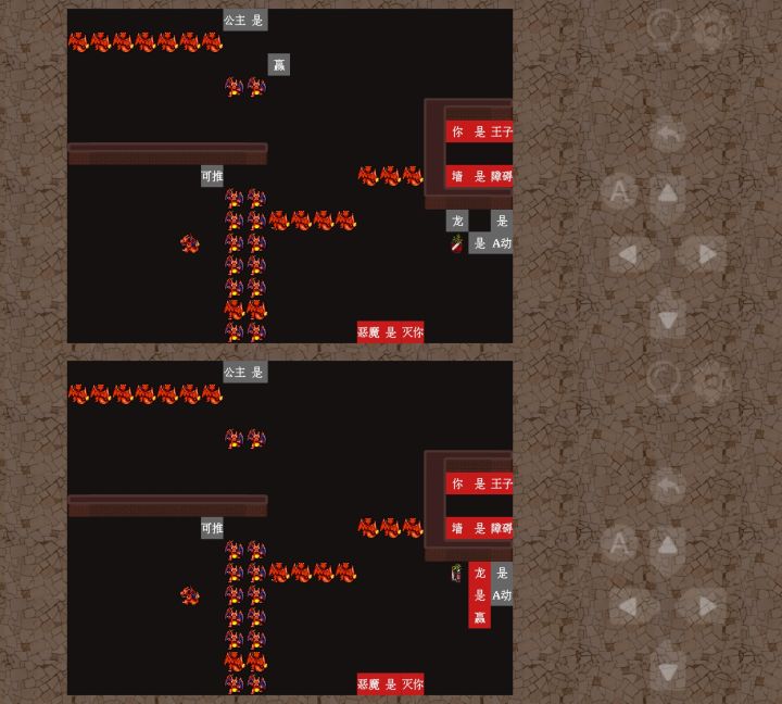 【龙】变成了A动,就可以上下随便走走,直至【龙】把“龙是”推至“恶魔”下面,组成“恶魔是龙”。此时所有的【恶魔】就会变成【龙】。