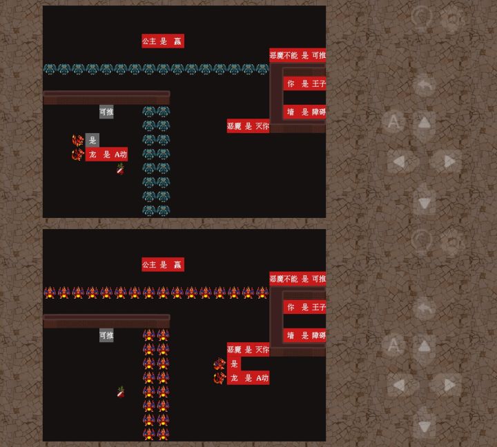 【龙】变成了A动,就可以上下随便走走,直至【龙】把“龙是”推至“恶魔”下面,组成“恶魔是龙”。此时所有的【恶魔】就会变成【龙】。