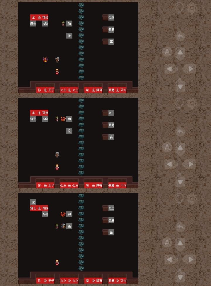 之后再操控【王子】向上推动左边的“是”一格。组成“龙是A动”,一直点A,直至“和”还有一格到“公主”下面,操控【王子】向上走一格。取消“龙是A动”。