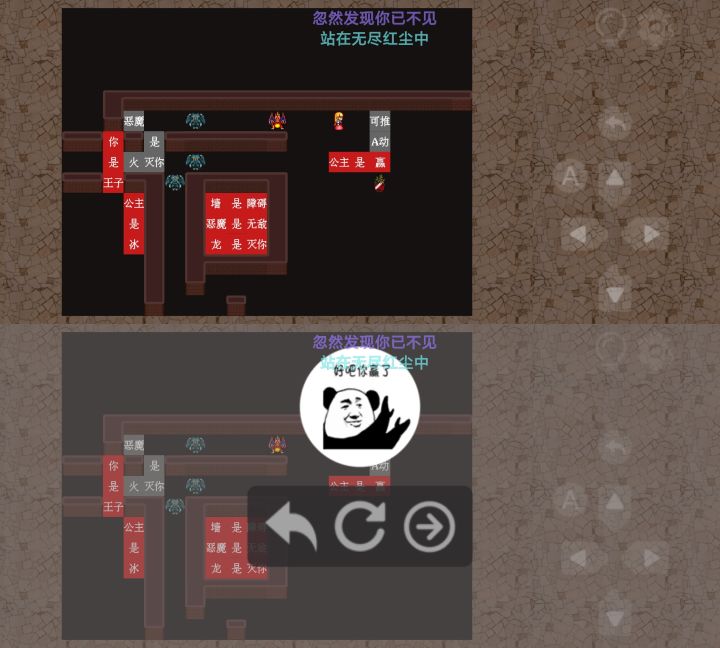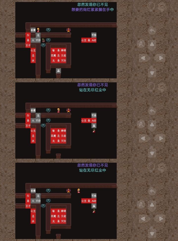 之后操控【王子】一直向左走,直至把“灭你”推至“恶魔是”下面,然后点按钮 A动 ,直至【公主】拆解“恶魔是灭你”。
