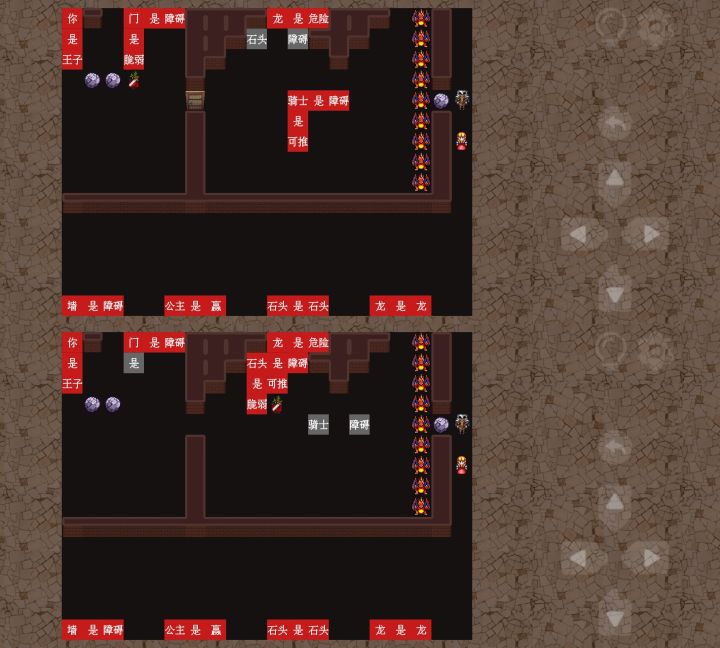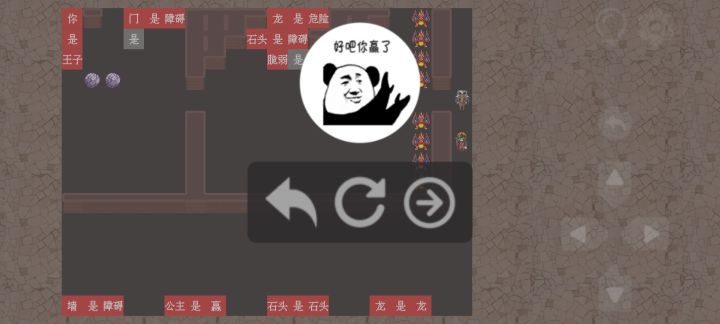 之后就可以操控【王子】直接破门而出,破门后先把左边的“脆弱”推到右边,并与其中一个“是”和“石头”组成“石头是脆弱”,再推动“可推”与另一个“是”和“龙”组成“龙是可推”。