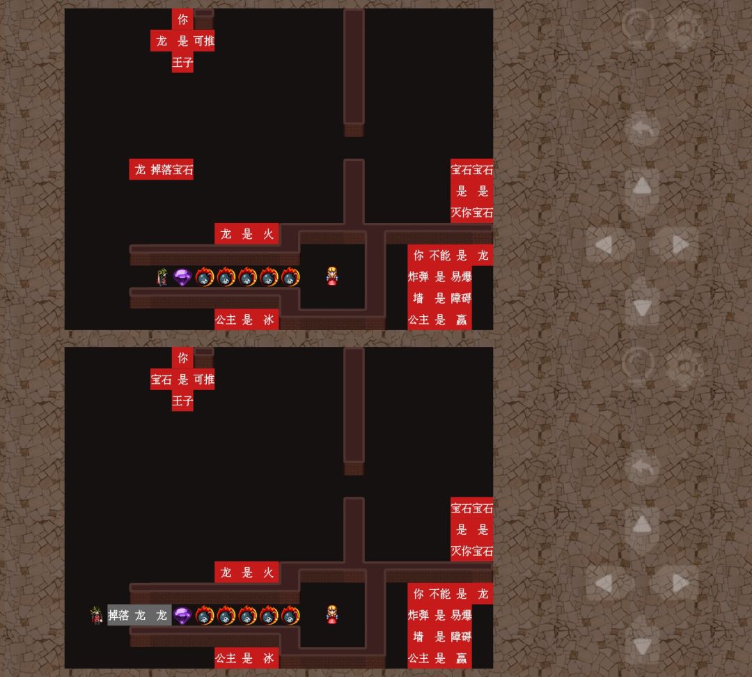 2、把右边的“龙掉落宝石”推至左边,并把文字组成图二所示位置,然后把🐉推至下方💣出引爆第一颗💣,掉落【宝石】。