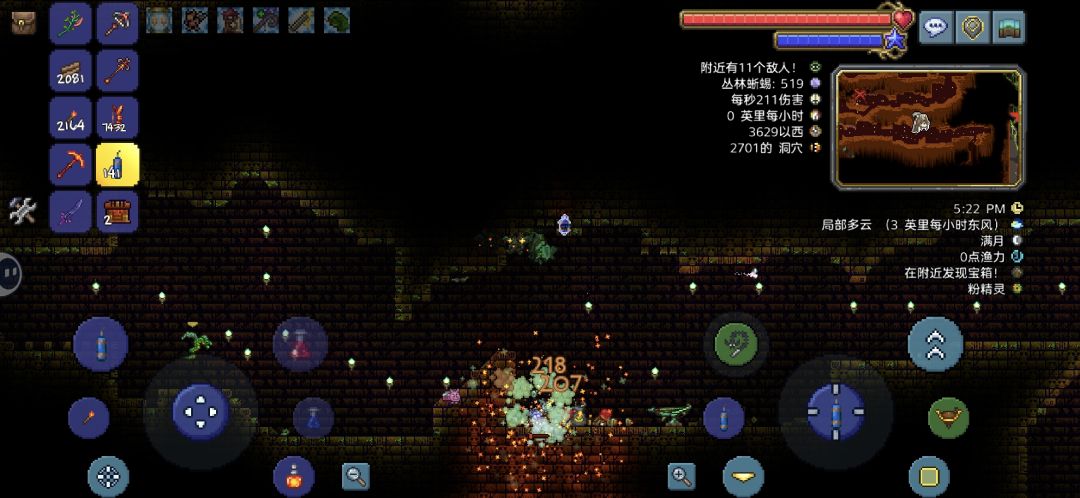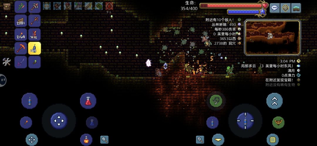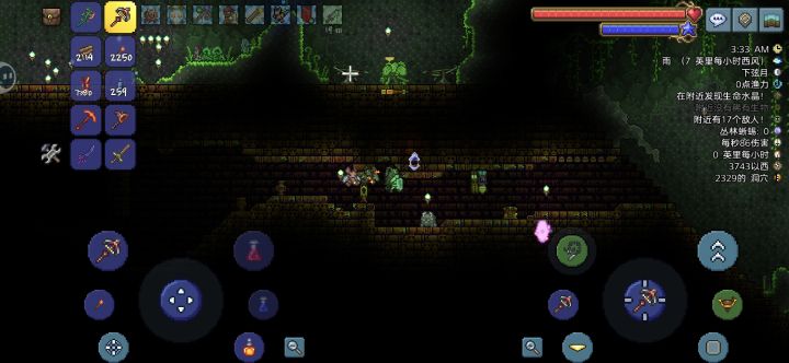 打怪时要注意的是丛林蜥蜴有时候会冲刺,应该是个技能,这时候连挥舞的永夜刃都挡不住丛林蜥蜴近身伤害。但这时候可以勾住天花板让丛林蜥蜴打不到,然后扔黏性雷管下去炸怪和安置哨兵自动攻击。能飞的飞蛇只要挥舞永夜刃就好,近不了身。善用地形可以卡怪,一炸那叫一个一个壮观。
