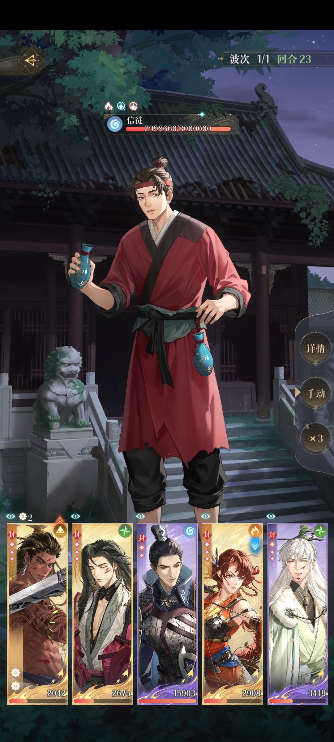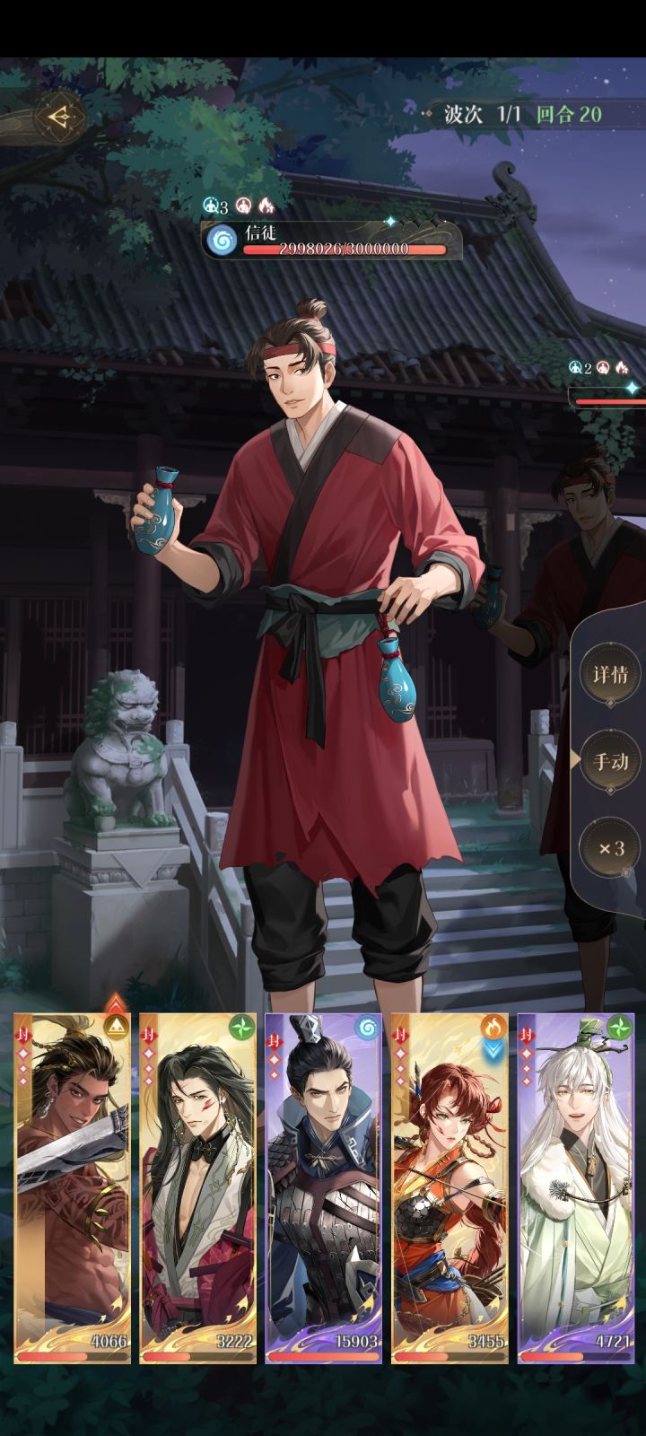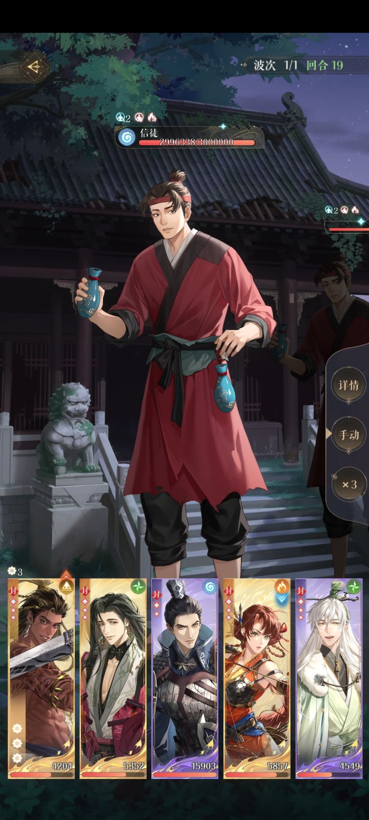 a.boss每次都能召唤出两个信徒当然最好,这样场上只有右边两个信徒的时候就全都攻击boss,如果是只有左边两个信徒在场上就嘉超良攻击boss香防御,渺该普攻普攻该大就大,boss大招时1号位超攻击其他防御(一直吉技能不被封的话二星是稳的,如果十几回合才被封技也是可以的比如图二)