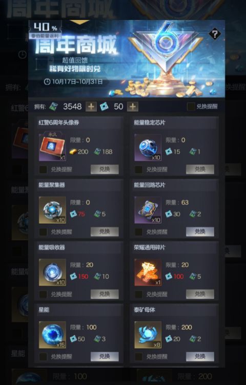 三、建议在荣耀同享期间根据自己道具留存情况,尽可能多做一些,比如点券夺宝的点券,勋章行动的钥匙,都可以这时候花,配置好次数。在周年商城和幸运折扣活动中消耗金条购买道具也可以享受返利哈,不知道哪些活动能参与返利的话,小编教大家一个最简单的方法,如下图所示,左上角标注“泰伯能量返利”的,就是参与返利的,冲吧!