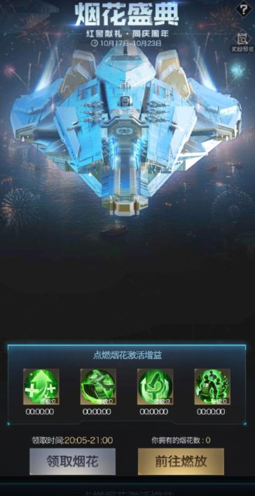 活动期间,每天20:05点至21:00可免费领取烟花道具。点燃烟花跳转至世界在您的基地周围燃放烟花,并随机激活1个增益效果,增益效果被激活后将提升等级。点燃烟花后除了激活增益以外同时也会获得相应的奖励哦,燃放烟花庆周年,果断定个闹钟,晚上8点就上去,先把烟花领了!