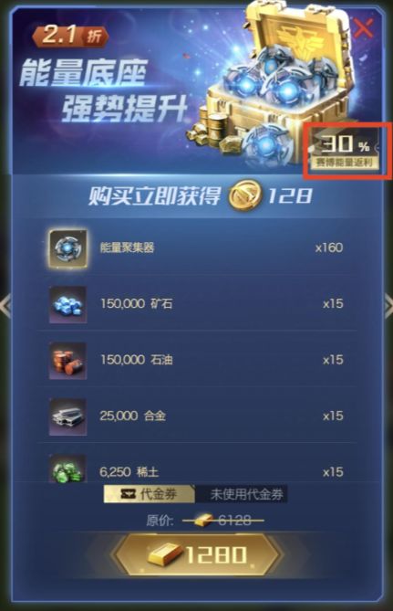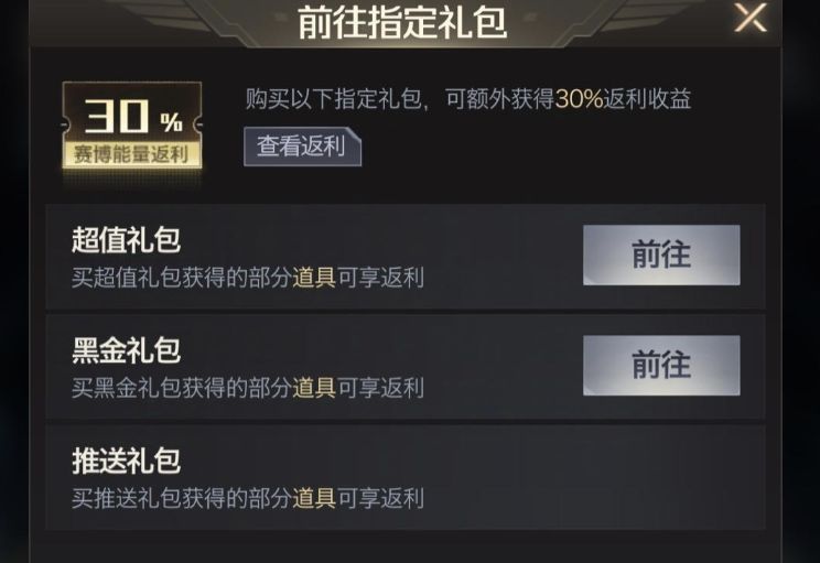 赛博能量返利主要侧重礼包类,比如主页面右上角推送礼包,超值礼包,特惠商城刷新出的黑金礼包以及做活动激发出的其他礼包,礼包的购买就看个人需求了,小编当前建议是根据自己情况购买升级超级武器的道具,这个方向目前提升实力比较大!