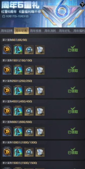 活动期间累计充值达指定金额即可领取对应奖励,六周年的福利力度还是比较大的,除了累充奖励外,前三天累充达到指定额度还有额外的奖励。