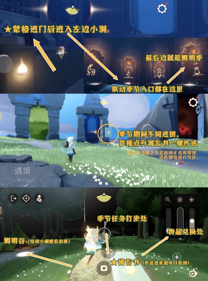 【季节地图-图二】本季节是联动季节,地图入口位于禁阁,和小王子、欧若拉、九色鹿三个联动季节在同一个入口。季节期间不用跑,直接点击姆明故事书(图中的寓言书)一键传送。