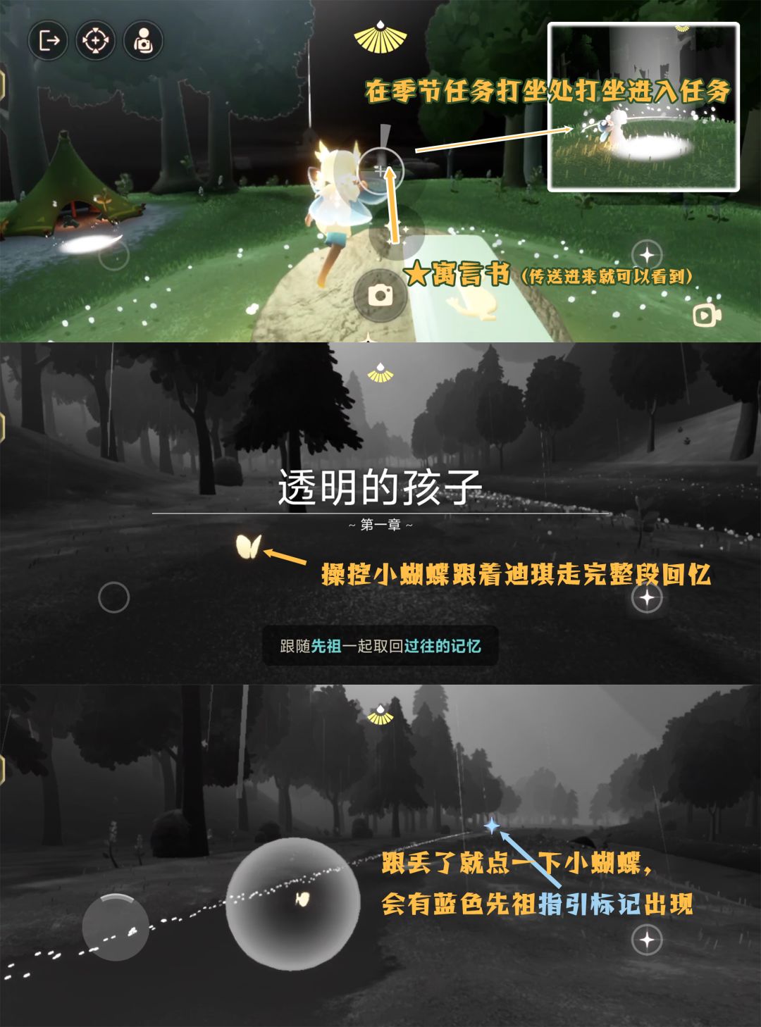 进入姆明谷后我们会变成一只小蝴蝶,操控小蝴蝶跟着迪琪走完整段回忆,如果跟丢了就点一下蝴蝶,会有蓝色先祖指引标记出现。