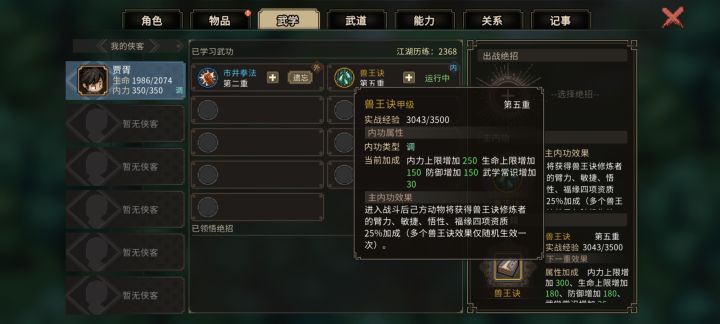 求助一下,兽王诀四分之一属性加成我怎么没看到?我五维20可狮子面板看不出属性变化,甚至我战斗中卸下内功,狮子伤害也没变化。只有状态栏能看到兽王诀的词条,所以,兽王诀加成加那去了?