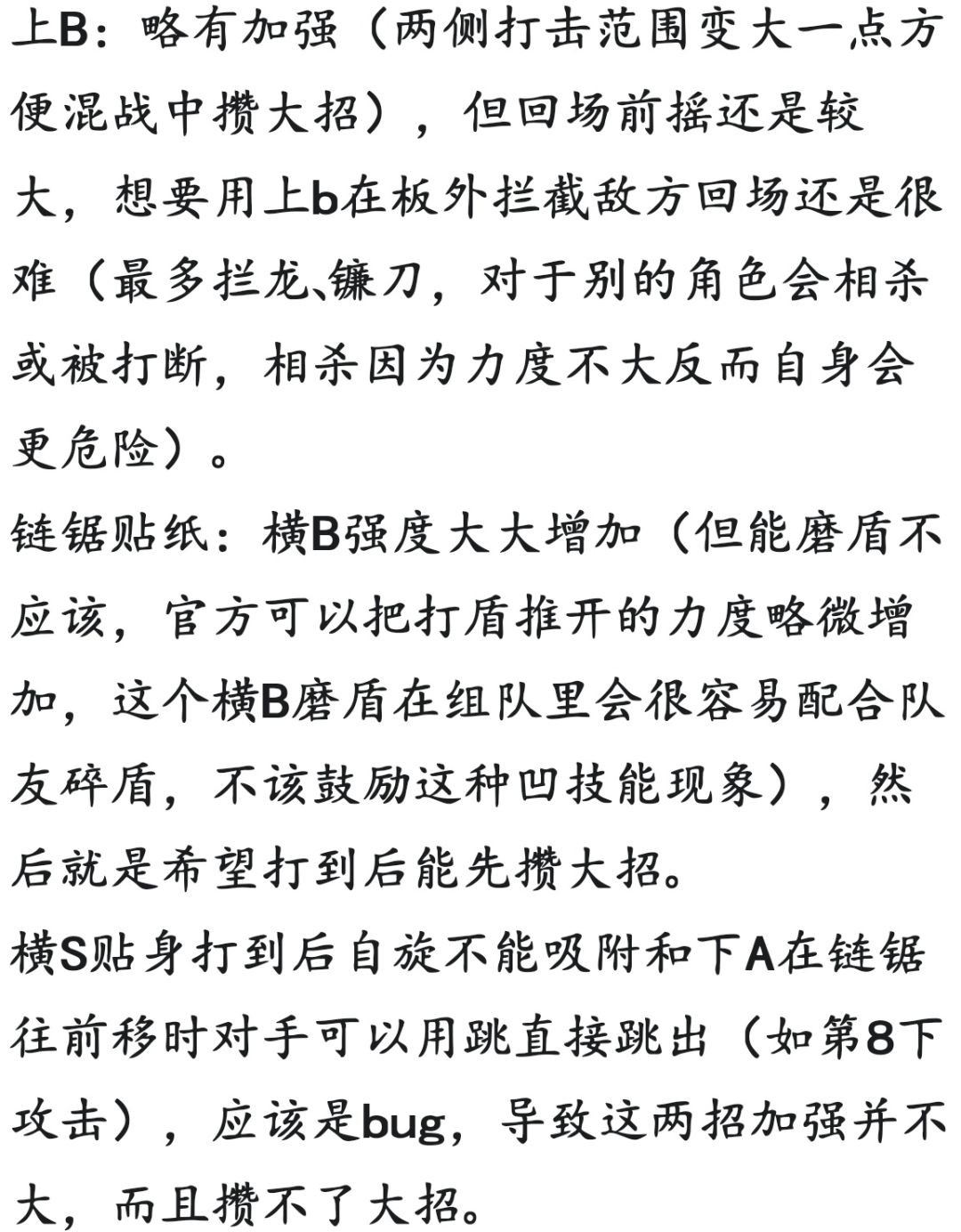 下A:命中率增加,但用处较小使用率还是非常少,单看招式强度少许增加(指因为加了后摇命中后接不上连招也不能用于斩杀),其实可以命中后后摇减少,后摇作为惩罚就是为了防止凹招的,不是应该招式收益越大后摇越大才对吗?我打中了别人,甚至别人还能在我后摇结束前反打我或拉开距离,那后摇是为了在这个时候惩罚自己的吗?有个别角色能在低击飞值被身后下A打到后反打雅典娜。还有带链锯贴纸后自旋时打不到抓边的敌人,只有第九下才能打到,而且就算用这个打抓边,对面甚至还能受身上板抓后摇。