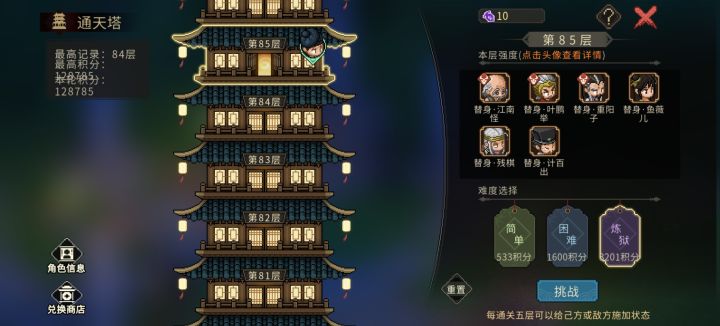 爬塔的话我没养宠物,没养队友就挂了个唐婉儿加福源,爬到85层还是被一棒子普通攻击满血敲死