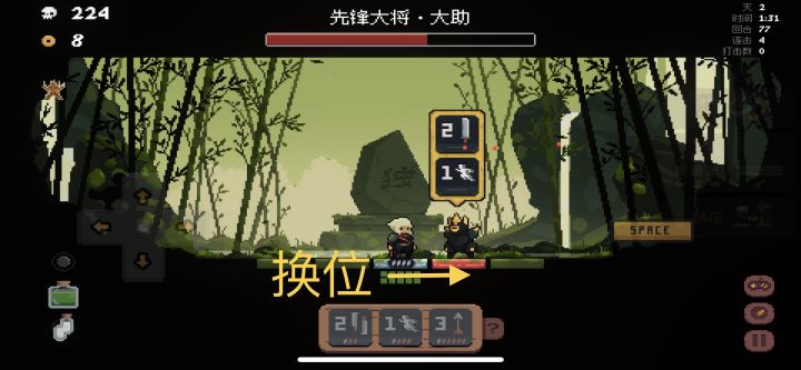 他还有一个二段伤害技能(被打到任何一次二段伤害都意味着无伤失败,有盾也必扣血),在看见他上了一个冲刺行动后,立马向他靠近,在他准备行动时与他换位(图3)