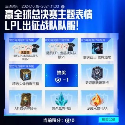 奖励:随机LPL出征战队签名队服,精选头像自选宝箱,史诗皮肤臻享卡等好礼