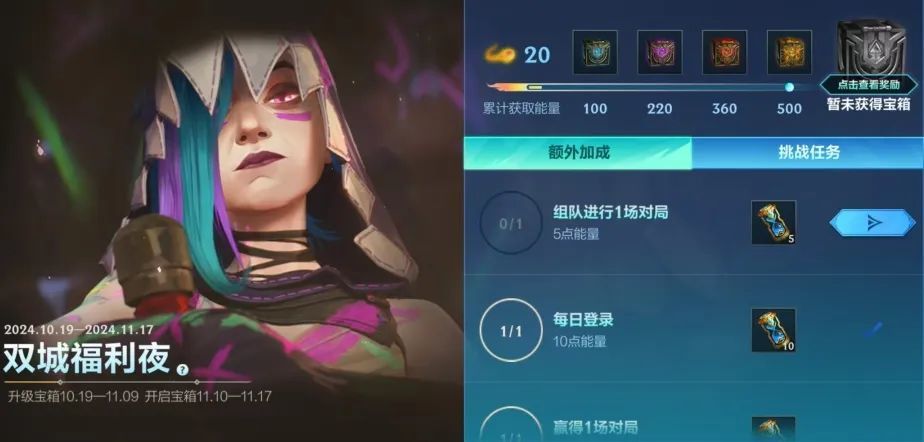 全新版本上线,双城福利夜来袭!即日起至11月17日,召唤师完成任务获取能量,即可轻松升级皮肤宝箱,还有龙魂水晶好礼等你来拿。11月10日当天登录即可开启宝箱,最高可获得史诗皮肤~