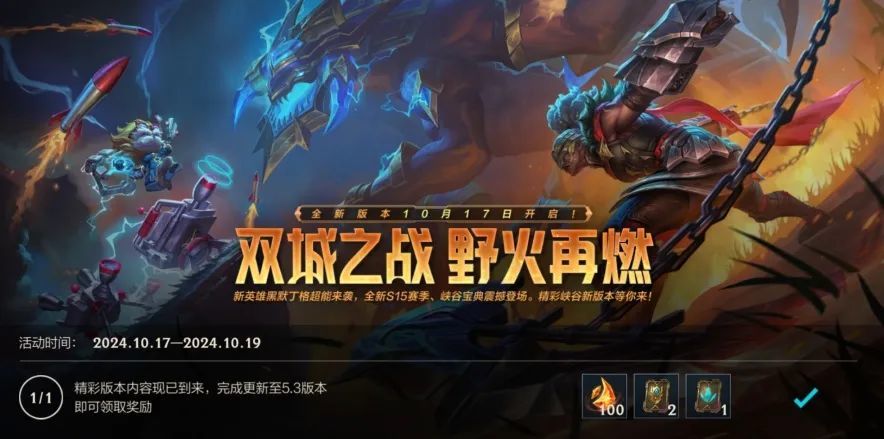 版本更新有礼最后1天啦!截止至10月19日(今日),召唤师完成更新至5.3版本即可领取龙魂水晶*100、团队胜利加成卡*2、3胜双倍晶石卡*1奖励~