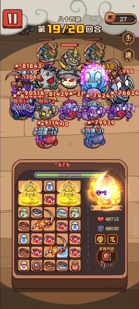 以下这张图表示了两个1星月刃,一个2星月刃加一个1星钟就可以稳过84第一回合!月刃是自带穿透的,所以我们尽可能的点击怪物集火,一次打四五个怪,甚至六个!达到攻击最大化!这个简单吧,不需要教了哈!