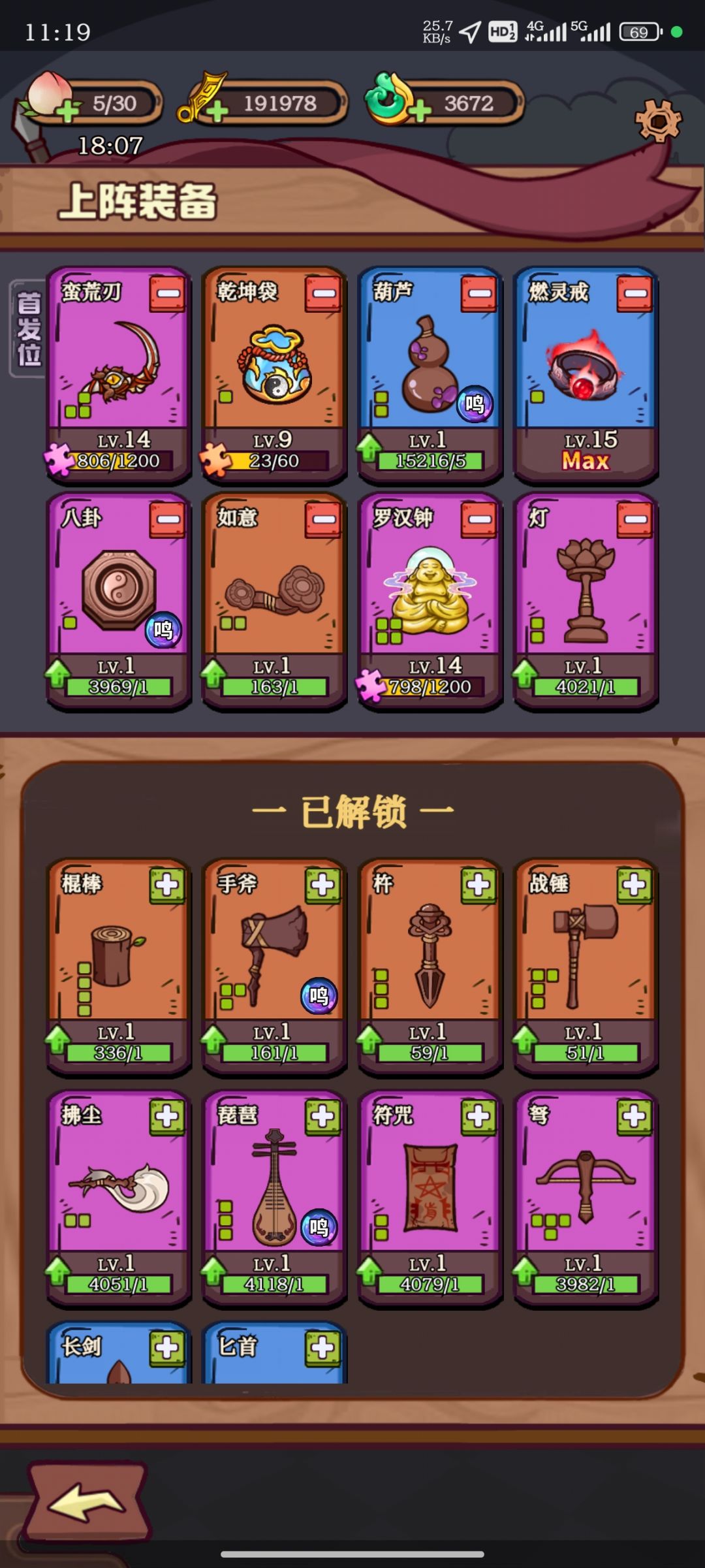 14蛮荒刃+14罗汉钟+15燃灵戒+9级乾坤袋(猴子我的是八级,七级也可以哦