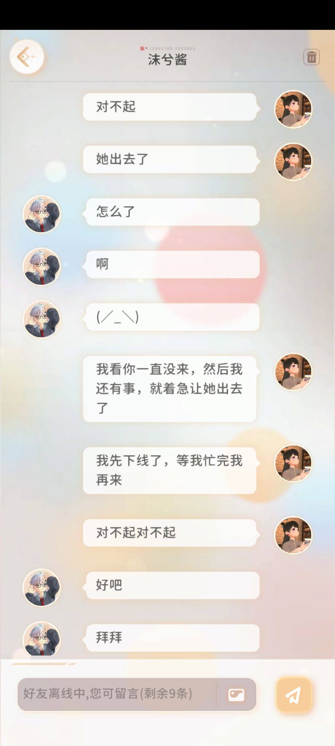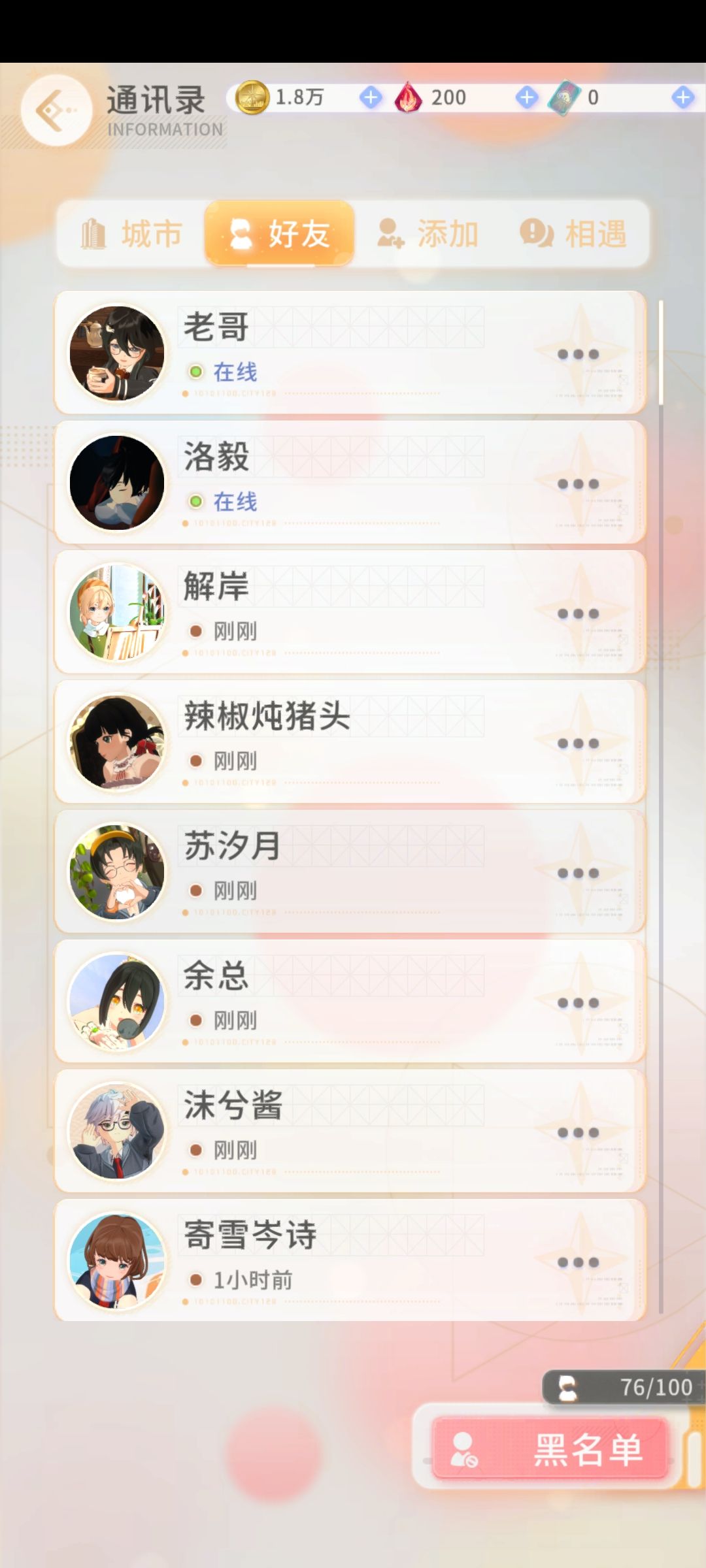 在游戏里跟好友约定好了一个时间一起出游,但是总是会错过,然后就变成了图片中的那样,上线的时候想看好友在没在线上,也都是显示刚刚离线,错过了和好友的约定(我真的不是故意的),真的会很不好意思啊喂