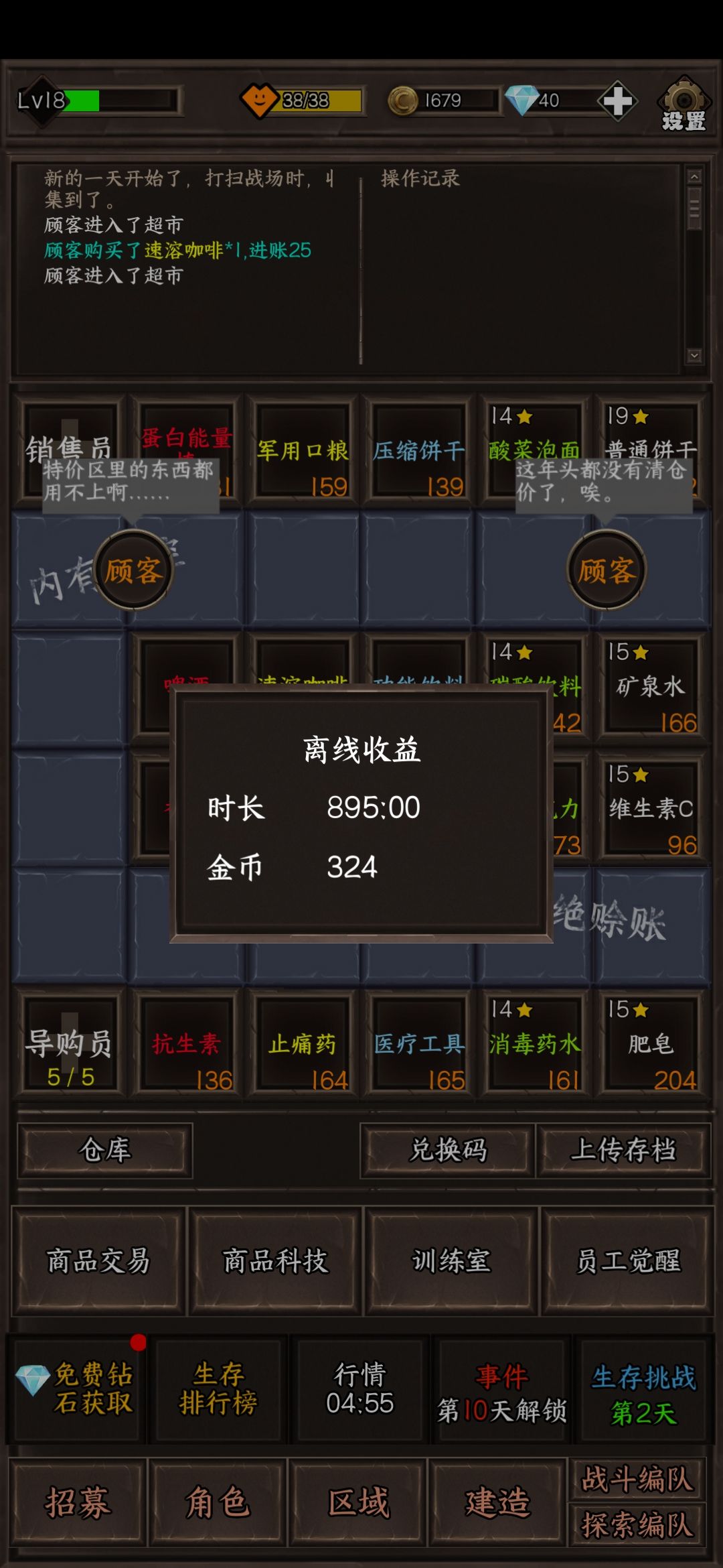 图一是刚发现的问题,第二次探索结束后的物资显示不再是箱子而是上一次开箱子后出来的物资,倒是没什么影响还是能正常开启就只是显示错误,然后剩下都是最近的离线收益截图,只能说挺随意啊,你说有上限吧图三时长208收益就到324了,图二时长339收益还是289,你说没上限吧,我看最高一直都是324,图五时长都895了收益还是324,你这离线收益回炉重做吧
