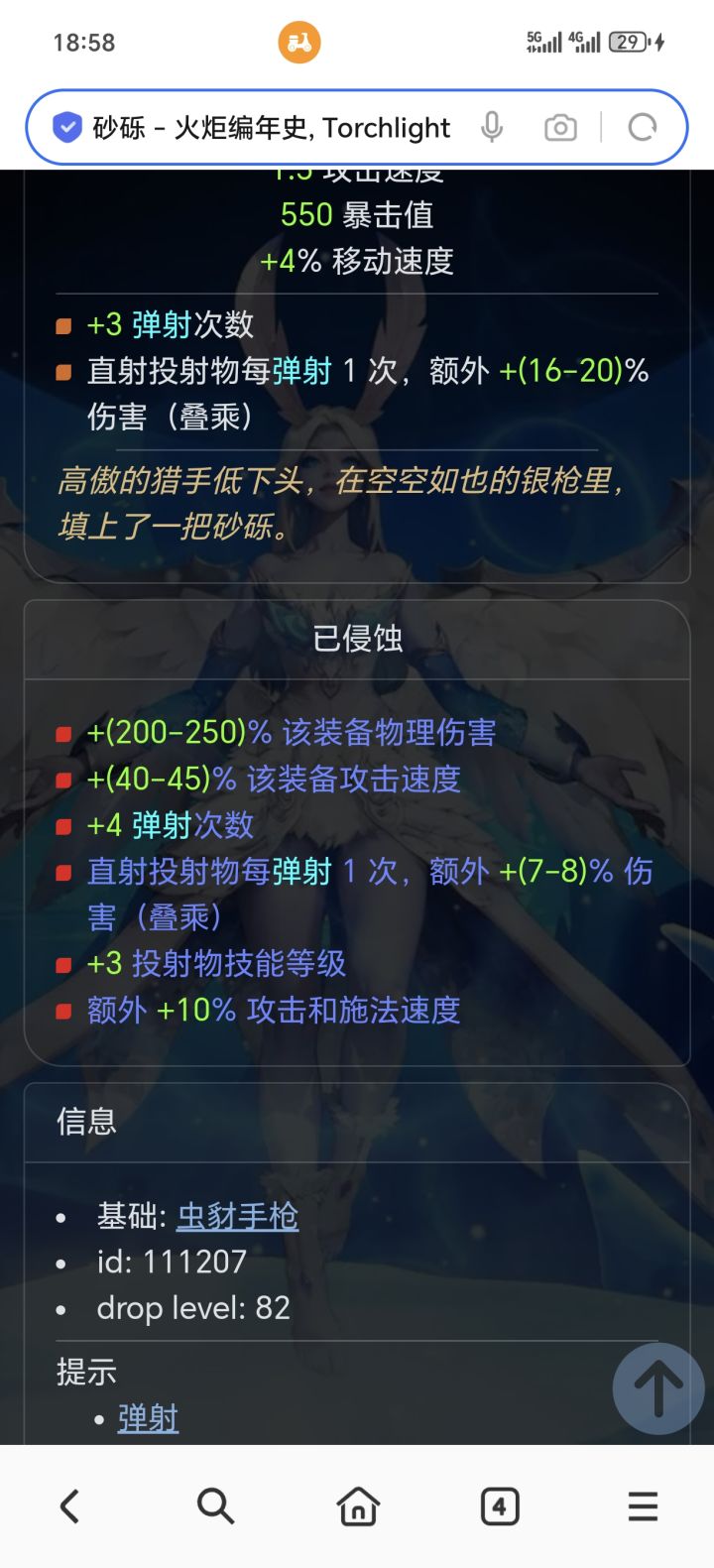 从文本来看 弹射能够弹射地面再弹射已弹射目标 且崇高技能表面 弹射弹射地面时不消耗弹射次数 这意味着什么? 相当于你计算砂砾叠乘时 弹射应乘以二进行计算 那么这倍率就极为恐怖了 而且现在冰锥术带上后 能将弹射次数消耗完毕且伤害会越来越高 一次冰锥术能造成十几次伤害 那么我仅计算最后一次的伤害 以毕业8额外砂砾4弹射毕业神射手举例 光这俩装备弹射次数就有11次 冰锥术1次弹射 双蜡烛2弹射 石板少算点 算4弹射吧 辅助技能2弹射次数 那就是总计20弹射次数 那么倍率怎么算呢 弹射次数乘2再叠乘 去除霰弹效应0.5 那么有多夸张呢 看最后一张图
