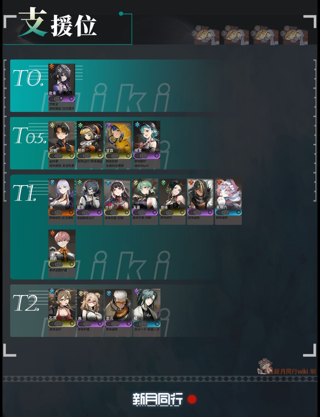 新月同行主要是以PVE为核心的游戏,因此本节奏榜更侧重于对输出角色进行综合排序,而对于当前泛用性不高的概率类角色以及驱散类角色的伤害面、前排角色的抗压生存能力以及辅助角色的增/减益能力适当调序,排序结果根据内测结果完成,并将在以后适版本情况进行实时调整。