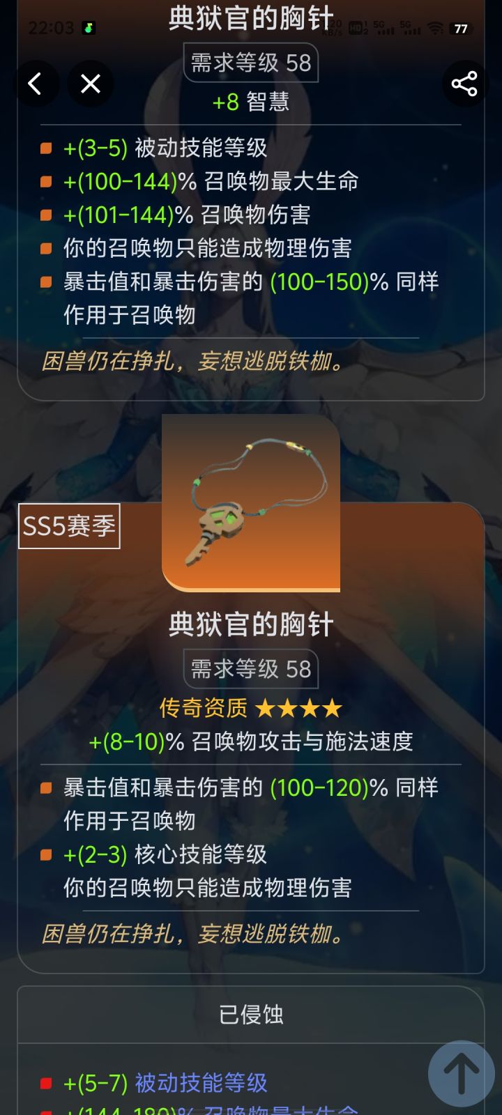 而且几乎只有灵戒和典狱官胸针有召唤物生命值加成,不装备典狱官胸针宠物很容易暴毙,买了吃不到技能等级加成,太恶心了