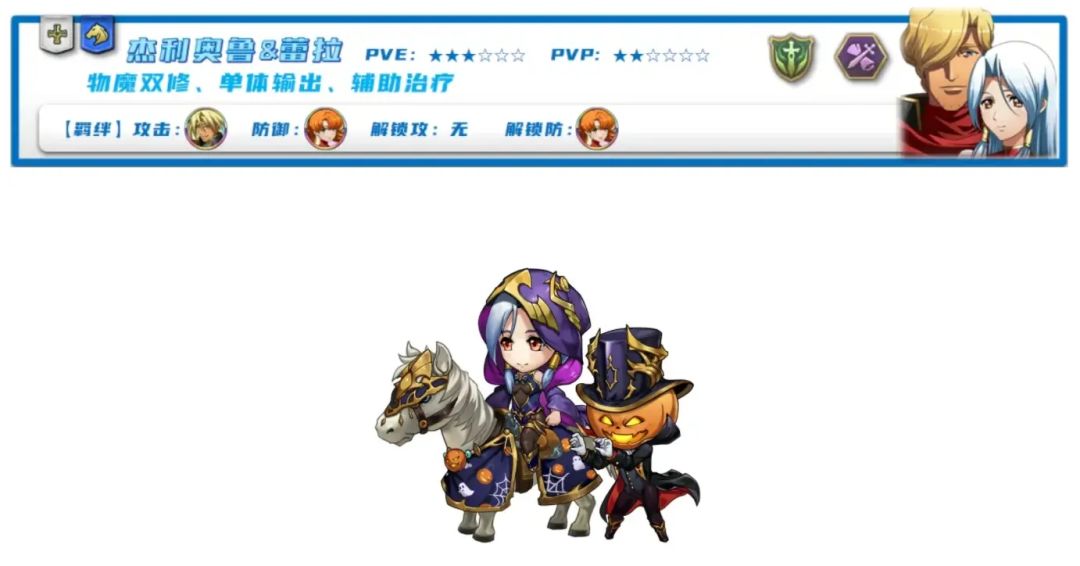 杰利奥鲁&蕾拉,是梦战三代英雄,俗称黑骑士。他是梦战第一个双人英雄,可以在男女之间不断切换。杰利奥鲁&蕾拉也算非常有特色,可以在男人和女人之间切换,男人主打物理单点和自身回复,女人主打魔法单点和群体回复。他在最初设计上有很大缺陷,攻击和智力都要堆,很难养起来,就成了游戏初期最垃圾的SSR英雄,抽到就会被全服“祝福”,已经成了梦战老梗。几次加强之后,虽然解决了双修等问题,但是英雄强度依然有限。练一个玩玩还行,可以体验一下英雄特色,如果为了强度就别练了。PVE中,杰利奥鲁&蕾拉可以兼顾输出和回复,还可以根据需要切换物理和魔法伤害。但是必须要配专属才能上场,配完了也没有多强,没必要练。PVP中,杰利奥鲁&蕾拉就是一个可以辅助治疗的普通输出手,毫无过人之处,完全没有练的价值。