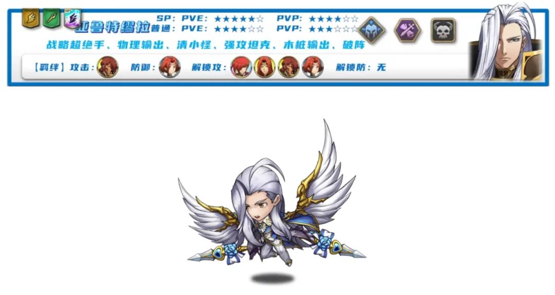 亚鲁特缪拉是梦战三代英雄,利古里亚帝国的元帅,俗称元帅。他是战略大师阵营超绝手,很擅长持续作战。开了SP之后,元帅的持续作战能力进一步加强,还有了聚怪的功能。除了抽卡之外,亚鲁特缪拉也可以通过30级世界事件奖励的超绝自选礼包获得。元帅拥有全游第一档的超绝特效:全体无视地形,实战中非常舒服,谁用谁知道。另外一个主流超绝手格伦希尔不适合打木桩战。兰芳特倒是适合打木桩,但是要开SP才厉害。所以玩战略还是建议练元帅的。另外元帅很擅长持续作战,特别是打多个精英小怪,很容易再动,而且越打伤害越高,万军之中依然越战越勇。开了SP之后,元帅可以把怪都拉到自己身边,再逐一消灭!PVE中,元帅是前期战略阵营的核心。推图时带着一帮大长腿真的是又快又爽,木桩战中也可以提供超绝,有小怪时输出更高。SP元帅也可以利用拉人来秀一下操作。PVP中,元帅是个合格的超绝手,带超绝也不会太拖累战斗力。实战中主要用拉人技能来破阵,但是腿太短了,使用难度非常大。