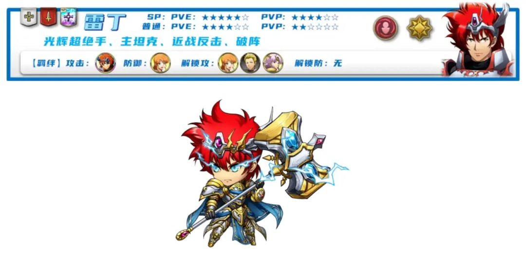 雷丁是梦战一代男主角,光辉军团阵营超绝手,人称大丁丁。他是会拉人的反击型坦克,拥有最恐怖的近战反击伤害,是第一代八大金刚之一。除了抽卡之外,雷丁也可以通过30级世界事件奖励的超绝自选礼包获得。雷丁是一个双防转攻坦克,还可以喊光辉超绝。同时他也是一个颇具争议的英雄,喜欢的很喜欢,不喜欢的很嫌弃。首先他有着强大的近战反击输出和拉人能力,是非常优秀的PVE坦克。但是使用难度比较高,培养难度也偏大。可能并不适合部分新手,也不适合喜欢简单粗暴玩法的玩家。开了SP之后,雷丁的硬度更高,护卫也更稳定。PVE中,雷丁是个合格的功能型坦克,反击高,能拉人,还能喊超绝。在部分挑战本表现出色,抄作业也经常能用到。PVP中,雷丁主要是担任功能型副坦克的职责,扛伤害的同时找机会破阵,顺手还能喊个超绝。偶尔能上场。--------------------