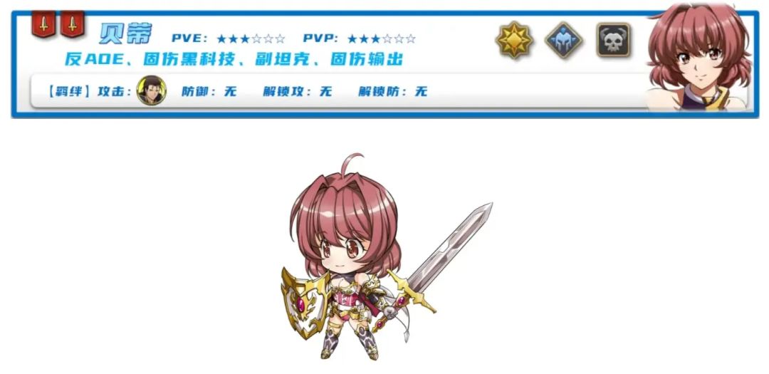 贝蒂是梦战一代英雄,兰斯的妹妹。她会在周围友军受伤时,立即进行反制,是一个非常克制AOE流的功能型坦克。任何敌人攻击贝蒂和身边友军时,贝蒂都会对其造成固定伤害和各种弱化。挨打的人越多,固伤也就越疼。大部分脆皮英雄一个范围伤害技能打过来,都会被贝蒂直接弹死。PVE中,贝蒂本身战斗力非常弱,没输出也扛不住。最大的优势就是天赋的无限固伤黑科技,在几次挑战中大放异彩。不过很快就被策划针对了,以后能不能用就不好说了。PVP中,贝蒂很适合针对纯AOE莽阵,如果能选到贝蒂和足够的奶,会非常厉害。但是首先要看环境中AOE流多不多,遇到了还要能选到贝蒂和奶,条件非常苛刻。因此贝蒂更适合作为淘汰赛的备用英雄,可以有目的性的反制AOE流,或者反制某些拥有多段AOE伤害的英雄。