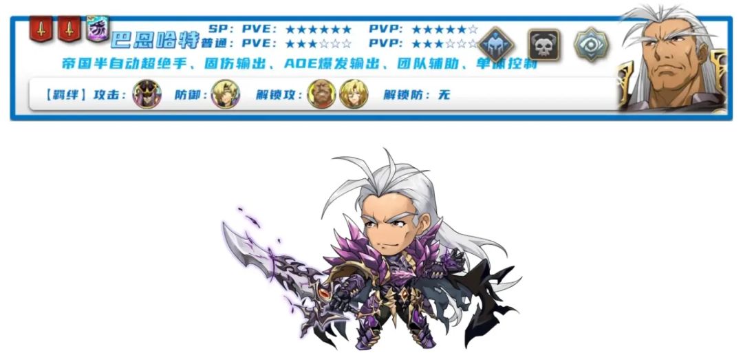 巴恩哈特是梦战二代的帝国皇帝,第一个支配魔剑的男人,俗称皇帝。他是帝国之辉阵营超绝手,拥有强力弱化光环,还可以造成大量固定伤害。开了SP之后,皇帝整合了多个技能,成为会突进的强力龙职英雄。除了抽卡之外,巴恩哈特也可以通过30级世界事件奖励的超绝自选礼包获得。皇帝是帝国阵营超绝手,可以通过光环大幅度降低周围敌人属性,还有多种手段造成大量固定伤害,也可以带多种会固伤的小兵。皇帝还很擅长打AOE爆发伤害,带了盾击还能晕人。开了SP之后,皇帝学会了附带4个优秀技能的突进技能,弥补了腿短和单点弱的缺点,技能选择也变得非常灵活。开了铸纹之后,巴恩哈特喊超绝后可以再动,成为帝国最强超绝手。PVE中,前期的BOSS既吃眩晕,又吃百分比固伤,皇帝可以玩玩黑科技。后期的皇帝主要还是凭借光环来打纯木桩战,面对高属性BOSS时表现非常不错。开了SP和铸纹之后,皇帝综合能力提升很大,虽然伤害不够顶级,但他功能性强大,还是帝国自动超绝手。另外,皇帝的固伤能力超强,多动能力在部分机制副本中也很有用。现在有些BOSS既吃眩晕,又吃百分比固伤,皇帝直接虐杀!PVP中,非SP皇帝腿太短了,完全上不了场。开了SP之后,皇帝加强很多,但节奏还是太慢,直到开了铸纹,皇帝才算是完全体。节奏快,能喊超绝,能打AOE爆发伤害,也有控制。虽然能上场了,但是要耗费大量资源,新手慎重。