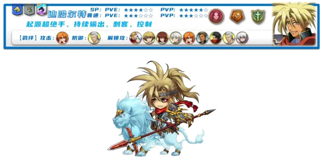 迪哈尔特是梦战三代男主角,光之起源阵营超绝手,俗称二哈。因为剧情需要,游离在5个女孩子之间,妥妥的梦战海王。他是可以过护卫的骑兵,杀人后可以通过专属晕人。除了抽卡之外,迪哈尔特也可以通过30级世界事件奖励的超绝自选礼包获得。前期的迪哈尔特是个很普通的骑兵,主要用来喊超绝。带上专属后杀人就可以再晕一个,觉醒后不杀人也能晕人。开了SP之后,二哈升级为长腿刺客,斩杀线明显提升,换人能力很强,操作好还能再晕一个,就是没什么自保能力。另外SP二哈还可以给女生喊双人超绝,持续输出能力也有明显提升。PVE中,二哈虽然会喊起源超绝,但是没有另一个超绝手芙蕾雅实用。晕人功能也不够稳定。输出方面,需要花费大量资源开SP才勉强够用,即便如此也比不上新英雄。基本没什么太大价值。PVP中,二哈的技能组不适合带大超绝,最多喊个双人超绝。换人能力虽然很强,但是没有处理多命英雄的好办法。一人换一人还能接受,一人换一命就血亏了。晕人能力的实用性也一般,因为现在免疫太多了。总的来说越来越难上场了。