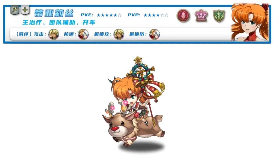 蒂亚莉丝是梦战三代英雄,第一代八大金刚之一,因为在坐骑上治疗,被称为奶骑。她可以为团队提供强大的群体爆发增益,还有群体战后回血能力。奶骑的天赋可以给队友加治愈之光,帮助队友在每次进入战斗后回血,是应对高频次攻击和降低战损的最稳定手段。但仅限单点和反击,面对AOE伤害时,就无效了。另外奶骑还有最佳单体攻坚BUFF,主动点人时提供高额减伤,觉醒后变成了群体BUFF,还能顺便开车。因此在保护坦克、伤害辅助、攻坚辅助等几个领域,奶骑都是顶级的。此外奶骑还是骑兵的移动模式,跑得快,但是容易卡地形。PVE中,蒂亚莉丝拥有群体战后回血和最强群体爆发增益,保护坦克和打RUSH流都很厉害。缺点就是对星级要求很高,面对范围伤害时比较弱。PVP中,一般不需要面对高频次攻击,奶骑的地位也就一般。主要用途是群体开车和群体爆发,莽阵打法勉强能上。