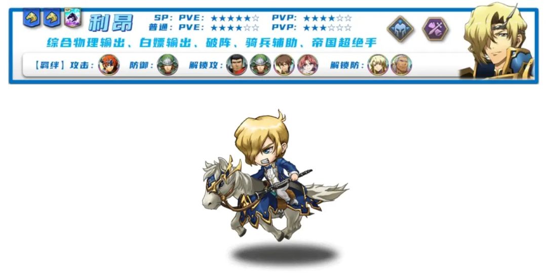 利昂是梦战二代人气英雄,曾经的大陆最强骑士,帝国之辉阵营超绝手,第一代八大金刚之一。利昂擅长白嫖,打完就撤。开了SP之后,可以强化整个骑兵大队。利昂最大的优势,就是打完后可以无条件撤3格。虽然会回撤的英雄很多,但是都没有利昂稳定。觉醒大招可以将敌人随机换位,达到破阵的效果。开了SP之后,利昂输出更高,新学了一个范围伤害技能,还可以铺固伤地形。最重要的是,他可以强化整个骑兵队伍,全体增加伤害,还不会被卡地形,解决了骑兵最大的烦恼。PVE中,利昂打完就跑的天赋非常舒服,推图和打木桩都很不错。就是不会再动,导致伤害比不过新英雄。开了SP之后,利昂功能更加多样,但最核心的还是对骑兵大队的辅助,部分副本中还是挺有用的。PVP中,利昂不会过护卫,伤害不够秒坦克的,硬度也不太行。大招虽然能破阵,但还是需要队友配合才能杀人,不是很好用。最后也就打AOE流时还有点用。考虑到耗费资源太多,还是别练了。