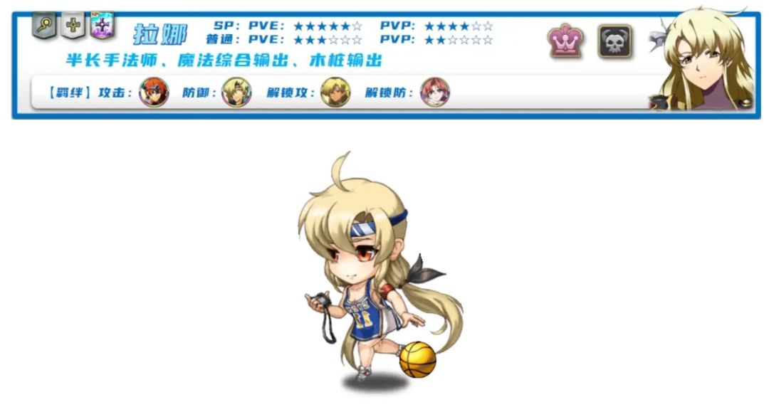拉娜是梦战二代英雄,利昂的老婆,莉亚娜的姐姐,第一代八大金刚之一。拉娜专精于各种元素魔法,曾经是游戏初期的长手法师。开了SP之后,拉娜持续伤害有了明显提升,单点稳定打3格,AOE的范围更大。拉娜在游戏初期还是很猛的,但是现在遍地都是长手法师,普通拉娜已经完全跟不上版本了,除了伤害够用以外毫无优势。开了SP之后,拉娜学会了随机减1-5回合冷却的被动,持续爆发能力大增。单点虽然只能打3格,但是伤害很足。范围伤害不仅伤害高,范围也很大,持续输出能力数一数二。而且SP拉娜可以带洗罪者,身板也硬气了很多。PVE中,普通拉娜已经完全没有培养价值了,必须开了SP才能用。单点输出虽然很高,但是不如主流长手法师实用。主要还是用来打持续AOE输出,资源多就很值得练。PVP中,普通拉娜更是毫无价值。开了SP之后,勉强能打一下阵地AOE流,但也就仅此而已了。能用,但是并不算厉害。