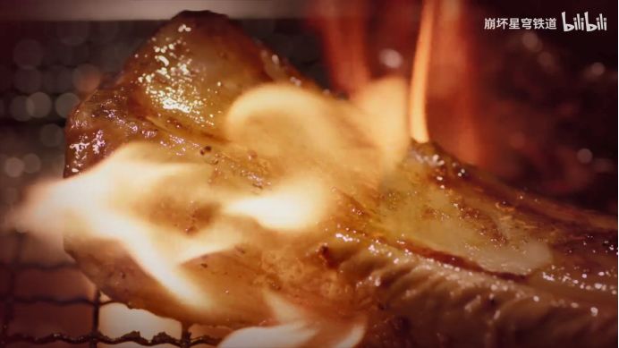 打着炉灶,火苗跳动,烤架上的肉滋滋作响;切下肥瘦相间的肉块,撒下一大把香辛料……还没等观众从这与星铁画风格格不入的几幕醒过味儿来,忽地就是几张黑红色调的中式恐怖画面伴着一阵阴乐,恍惚中闪过一个熟悉的狐人轮廓,还有几个似乎是步离人的模糊色块。一开头,就让观众的脑海里满是异样感,胃口也就被吊起来了。
