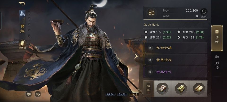曹操战法:乱世奸雄+蓄势待发+避其锐气。韬略库:合谋善本+孟德新书上卷(专属)+兵令善本。重盾兵特性不屈,专精点亮屹然不动。身处箕形阵前排的曹操,无疑要凭借自身在三谋里的人设特长,承担起掩护全队的职责。不过在此基础上,曹操为了力挺司马懿的输出,还是学了一手蓄势待发,这样就能保证司马懿随着回合数的推进而愈战愈勇。