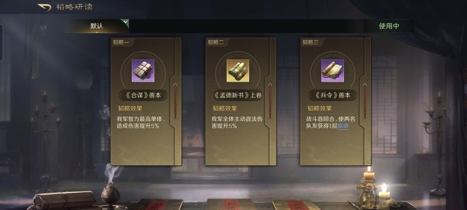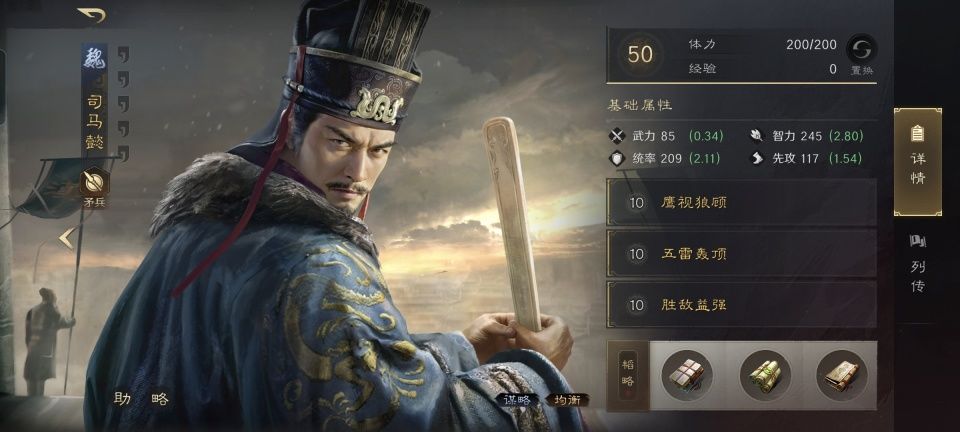 司马懿战法:鹰视狼顾+五雷轰顶+胜敌益强。韬略库:奇智善本+大略(专属)+料敌善本。矛兵特性鏖战,专精点亮负坚执锐。箕形阵后排的荀彧,基本不指望他攻击,核心作用是靠他提升司马懿15%的奇谋和看破。与此同时,再兼顾到治疗和驱散。