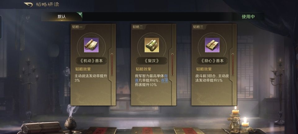 荀彧战法:建计举人+青囊急救+奇正相生。韬略库:机动善本+复汉(专属)+励心善本。长弓兵特性洞悉,专精点亮袍泽同心。